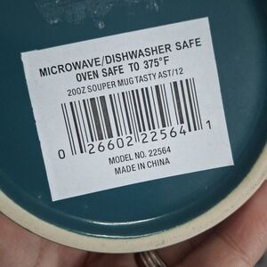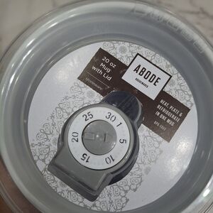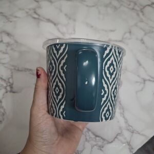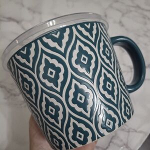 Stylish ABODE mug/container with a teal and white pattern. Comes with a convenient lid. For hot food or drinks