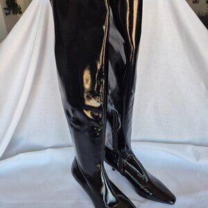 A kitten heel and pointed toe extend the look of your leg in a flattering over-the-knee boot in statement-making patent that zips down the side. Side zip closure Synthetic upper/leather lining/synthetic sole Imported