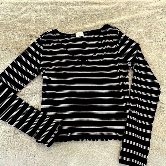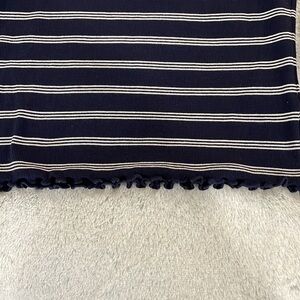 Very soft V-neck navy/white striped lightweight long sleeve cropped tee with scalloped bottom. Goes with everything.