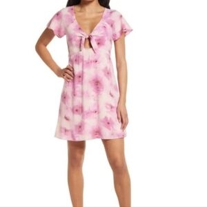 NWT Leland pink floral mini dress by Abound from Nordstrom. Ties at bust for perfect fit. Short sleeves. Mini length in skater, flowy fit. Fitted at waist. Watercolor pink floral print throughout dress. Lining throughout.
