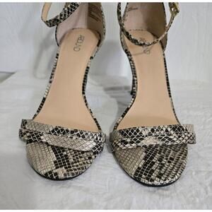 This is a pair of Abound brand stiletto shoes. Women's size 8.5. They feature an open-toe style with a strap across the toes and a thin buckle wrap for each ankle. They have a gray snake print design with 3" heel height. They've been worn a few times but in overall good condition, no major wear marks. Perfect for a work outfit, party, formal event, office, wedding, etc.