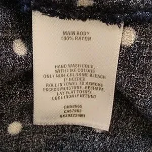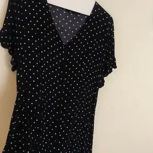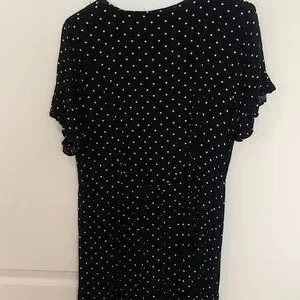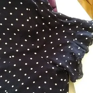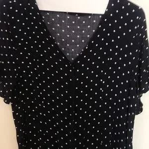Navy and white polka dot v-neck button down (8 buttons) mini dress. Short sleeve with end ruffle, Size XXL, 100% Rayon. Excellent condition. measurements: armpit to armpit 20", waist 19" with back tie to tighten, length shoulder to hem 33". Wear with heels or sneakers!