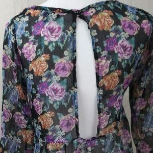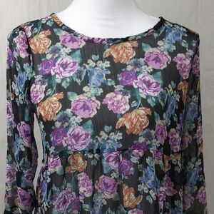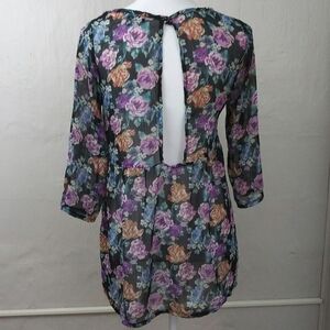 About A Girl Los Angeles Women's Floral Black Baby Doll Syle Tunic. Polyester Sheer. Button Key Hole Open Back. 3/4 Sleeves. High Low Hemline. No Elasticity. Measurements approx. Flat Lay.