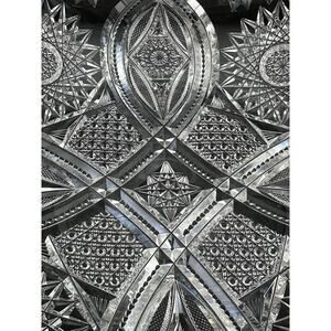 The ABP Antique Cut Glass Bowl with a Sawtooth Pinwheel Design is a stunning piece of Victorian-era decor. Made in America with a glossy finish, this round bowl features a beautiful American Brilliant pattern and vibrant clear color. Measuring 8.5" in diameter and 3.5" in height, this handmade bowl is perfect for all occasions and adds a touch of vintage charm to any room. Care instructions recommend hand washing only, making it a delicate and elegant addition to your collection. Please examine all the photos! There are some small chips on the sawtooth edge and some minor surface scratches from wear. The design is deeply cut and sharp, beautiful piece of American Brilliant. It weighs 3.6 lbs.