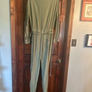 Elegant khaki jumpsuit with a sleek design. Features a zip front and adjustable waist tie. Ideal for versatile styling. RUNS VERY SMALL. Fits like a Medium