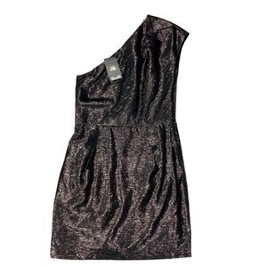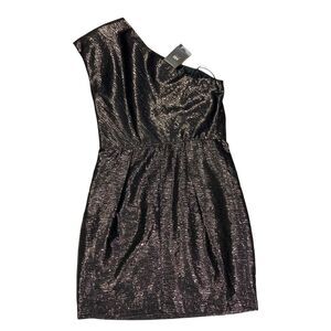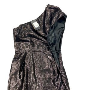 - Description: ABS Allen Schwartz Mini Dress Women 14 Brown Gold Metallic Shimmer One Shoulder Evening Formal