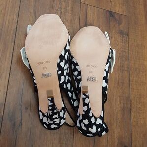 New without tags. ABS Allen Schwartz - Sophee Heart Bow Slingbacks. Black and white hearts and bow leather accent. Slingbacks. Rounded square toe. 4 inch heel. Leather bottoms.