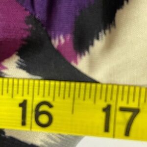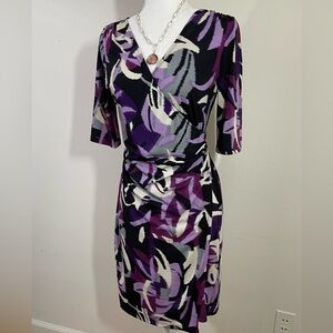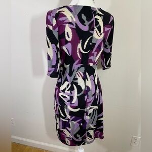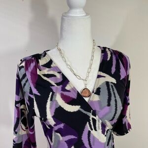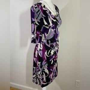 Super pretty dress in a faux wrap style. The left side of the dress has a pleated effect at the waist area and the dress drops down to a faux panel. 3/4 sleeves. Colors in the print are shades of lavender, gray, off white and black. The dress has stretch to it and is a comfortable weight. It even can work as a maternity dress. Measurements are pit to pit about 17”. The total length from the top of the shoulders to bottom about 37”. No visible flaws. Any questions please ask and we will try to answer them ASAP R 1