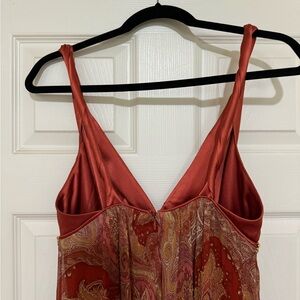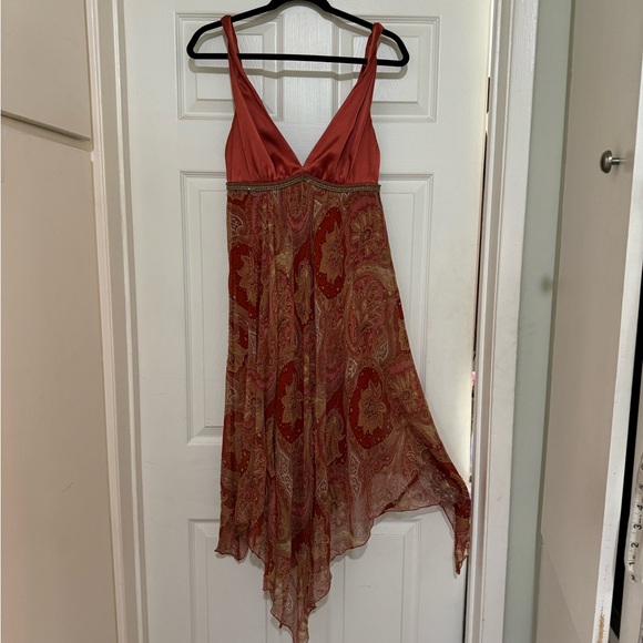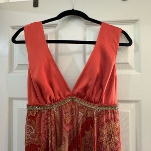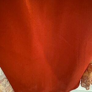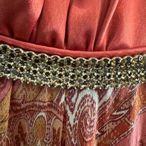 Dressy sleeveless front plunge floral dress with small beads sewn throughout the flowered pattern, high waist and A-line flare, below the knee, zippered back. Can wear with or without shoulder straps twirled. Original with twirled shoulder. Outer layer is made from silk. Color: Burnt orange. Size 8. Worn once.