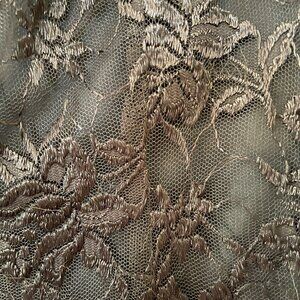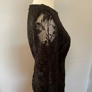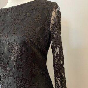 The perfect little black dress! Long lace sleeves and lace overlay on the body of the dress. It has a scalloped lace hem, back zipper and a high scoop neckline in the front. The body is fully lined; the sleeves are not.