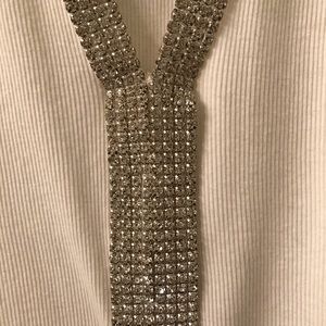 White tank with multi rows of rhinestones. Great shirt to dress up jeans or shorts. Matches with everything!