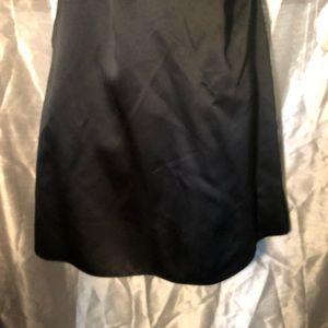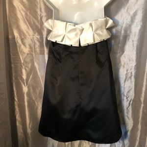 Black dress with white ruffle across top. Back zip closure. Boning throughout top.