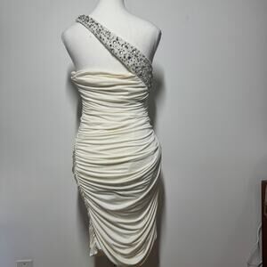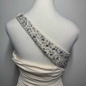 ABS by Allen Schwartz Dress Women M Ivory Beaded One Shoulder Ruched Y2K Formal