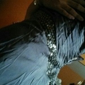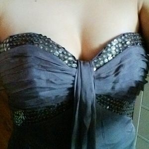 Beaded neckline and waist line. Wore once. Fully lined and corset top. Sz 4. It was in storage so its wrinkled. Lightly steam and hang will solve the prob. Really beautiful dress. 100%silk