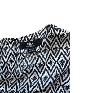Stylish and versatile ABS Platinum sleeveless blouse featuring a bold black and white diamond geometric pattern. Crafted from a smooth, lightweight woven polyester fabric, this top offers a polished silhouette perfect for both office wear and casual outings.