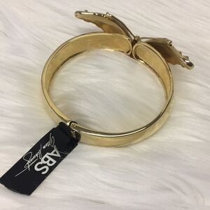 ABS butterfly hinge bracelet is so beautiful! It has clear, light pink and green stones with gold hardware. The butterfly is 3” across at it’s widest point. 1 1/2” height. Band is 1/2” wide. Inside circumference is 7”.