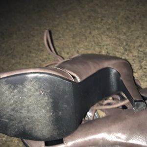 ABSOLUTELY BEAUTIFUL OPEN TOE TAUPE TIE UP VERY SEXY HEELS 👠 WORE TO A WEDDING .. PURE GRAIN LEATHER