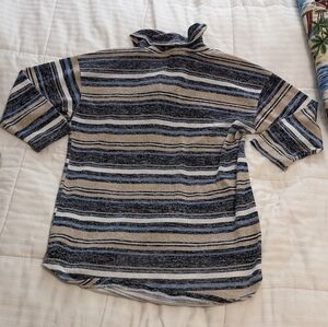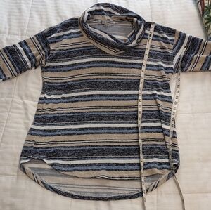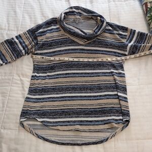 absolutely famous lightweight striped cowl neck sweater with 3/4 length sleeve size large the sweater is super cute nice and soft and lightweight. the stripes are pretty tan light blue navy blue and off white. B5