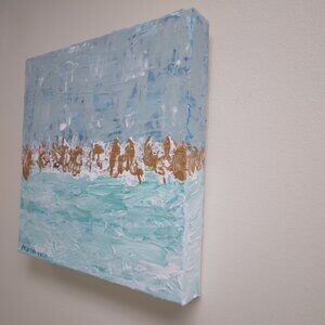 BLUES, GREENS AND GOLD ACRYLICS MAKE UP THIS ABSTRACT PAINTING BY MARY ANNE TROVATO, ARTIST. MEASURES 12" X 12" ON GALLERY WRAPPED CANVAS.