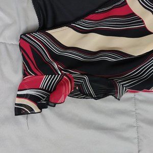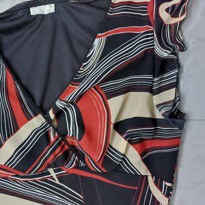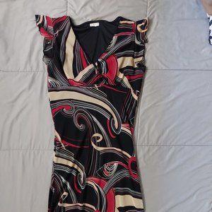 The dress is form fitting with a slight flare on the bottom. The neckline is a V with a slight wrap. The cap sleeves are sheer material.