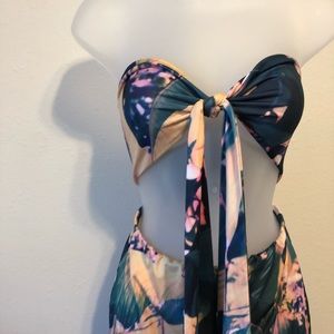 Super cute dress that is perfect for warm summer nights! It ties in the front and then you can use the straps to tie at the neck or behind you or just into a bow. It is a dress, although it’s open in the front it is connected in the back.