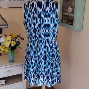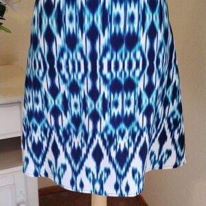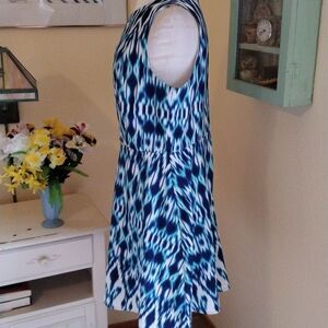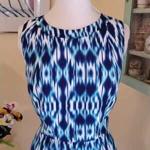 Beautiful blues in this Ikat inspired fit and flare dress. Fitted bodice. Fuller skirt with pockets. Top lined, back zip. Size 14 measures 42 at chest, 34 at waist, sorry no belt, 52 at hips. 37 long from shoulder to hem. A lovely dress for all year round.