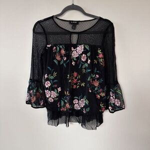 A. Byer Boho Black Sheer Embroidered Bell Sleeve Top S