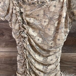 A.Byer Ladies Ruched Lace Ruffled Short Sleeves Top Blouse SZ Med Beige Silver