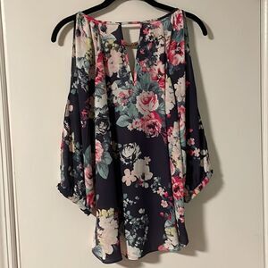 A. Byer floral cold open 3/4 sleeve keyhole neck and back with gold metal detail size M. Flowy, gorgeous blouse. About 19.5 inches from under one arm to the other. About 24 inches from shoulder seam to hem in front and almost 26 inches in back. No stretch woven. Next to new. Bundle with more items from my closet to save.