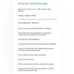 AC 1200 WiFi Cable Modem Router - 802.11 ac Dual Band Gigabit - Up to 340 Mbps