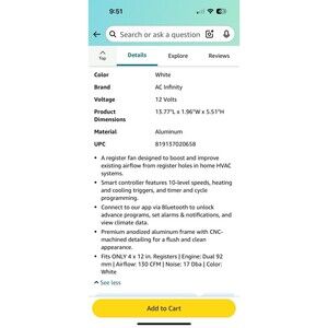 AC Infinity AIRTAP T4 White, Register Booster Fan for 4” x 12” Register Holes
