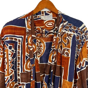 AC Sport Vintage Button Up Blouse Brown Blue Boho 70s Shoulder Pads Rayon Retro.