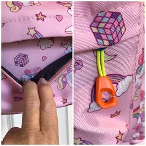 Sweet Rainbows and Unicorns Canvas Backpack for young girls In pink and lavender. She’s 14” x 10” x 5”, with adjustable straps and a chest buckle to keep straps together. Vinyl lining for easy clean and a large slip pocket for storage (non-padded). There’s a nice-sized front exterior pleated pocket, and the zipper pulls are neon. Beverage caddies on each side of bag. Slightly padded and woven adjustable straps with plastic buckles. This is roomy, but light, and it’s NWT! 🌈🦄
