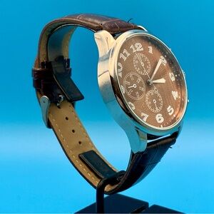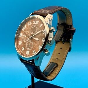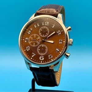 The product is a men's fashion wristwatch by ACCUTIME WATCH CORP with a silver case and bezel color, and a brown faux leather band. It features a quartz movement with a battery, a round watch shape with a bronze dial color. The watch is suitable for various styles such as formal, casual, classic, and dressy. It does not come with papers, the original box/packaging, or a manual/booklet. The watch has features like a central second, seconds hand, 12-hour dial, and a push/pull crown.