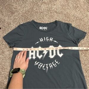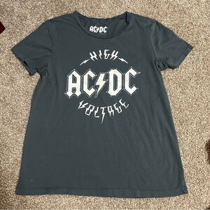 This band tee is a wonderful rocker tee. It has a classic high voltage logo. This top is a nice light stone grey with white lettering. This top would be great with jeans or it could be worn with a romper or skirt for more of a grunge look.