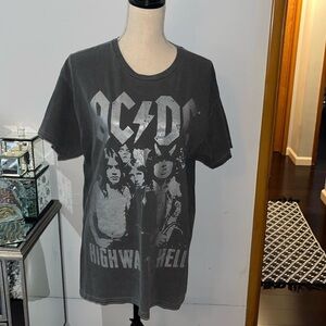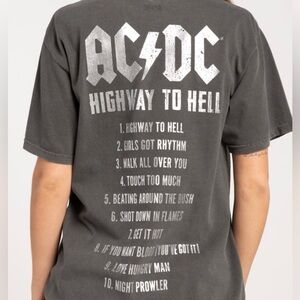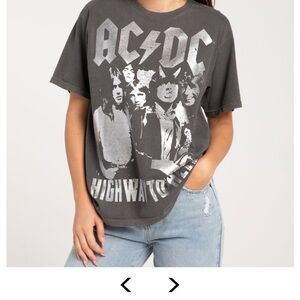 AC/DC Foil Boyfriend Tee. Large metallic graphic screened on front. Ribbed crew neckline. Short sleeve. Vintage wash. Oversized fit. 100% Cotton. Machine wash. Imported.