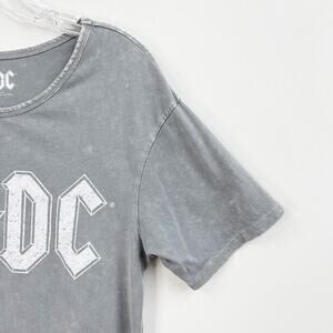 A stylish AC/DC graphic tee, perfect for any rock and roll fan. This gray tee features the iconic ACDC logo prominently displayed on the front. Its design includes short sleeves, a crew neck, and a unique fringe detail at the bottom hem, adding a touch of edginess to the classic band tee. The overall look is a blend of comfort and style, making it a standout piece.