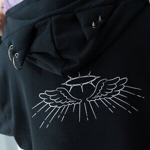 Step into the ultimate kawaii punk vibe with the Baby Punk Devil Punk Oversized Hoodie from ACDC Rag! This adorable rave-ready hoodie is designed with playful sublimation prints and patch details, all wrapped up in a comfy oversized unisex fit that perfectly blends sweet charm with rebellious edge. Featuring long sleeves with hidden slip pockets, a hood trimmed with delicate organza ribbon and topped with cute cat ears, plus a bold safety pin accent for that extra punk flair. Own your street style and channel the electrifying energy of Tokyo’s Harajuku fashion scene!