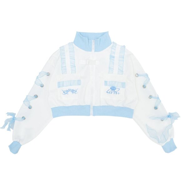 Electric waves, neon lights, digital music. The Cyber Jellyfish Cropped Jacket from ACDC Rag is at a whole new level. This futuristic rave festival jacket features a soft white colored on polyester base, contrast with pastel blue organza ribbon detail, dual front pockets, embroidered detailing, silver eyelet hardware, ribbed knit on cuffs and hem line, tech strap with slide buckle closure in the front, and secure plastic zipper closure. This Cyber Jellyfish Cropped Jacket came straight from the streets of Harajuku, Japan. If you love it, don't hesitate. Get it before it's gone. #HarajukuLove