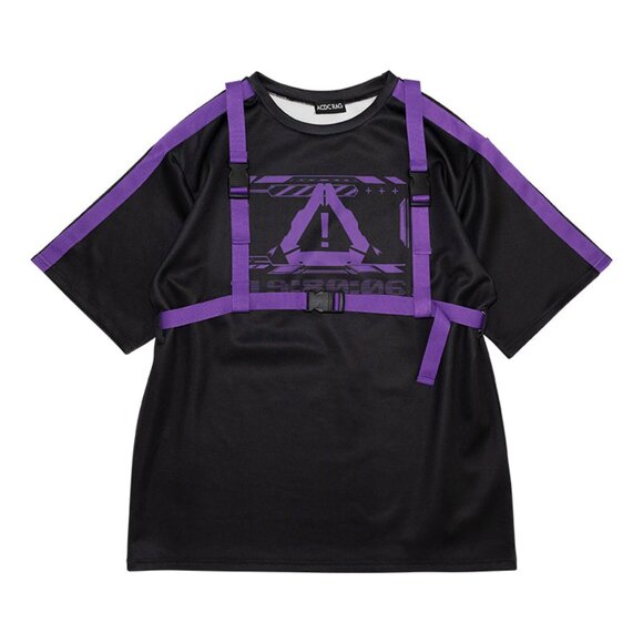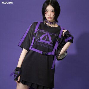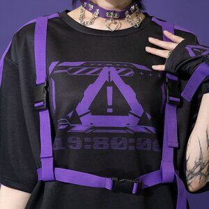 "Hack the system in the Error Code Cyberpunk Tech Oversized Tee from ACDC Rag. This futuristic rave t-shirt features a black polyester base is designed with glitchy purple graphics, oversized fit, crew neckline, short sleeves, and bold front and back matching tech straps detailing. Straight outta the underground streets of Harajuku, this tee is built for the digital rebels and late-night ravers. Love it? Grab it before the signal fades.