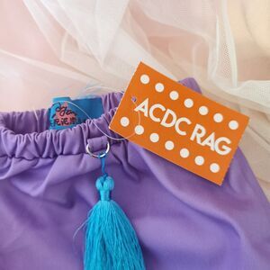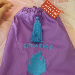 The listing is for the pair of new with tags Japan Import ACDC RAG Brand purple leg warmers with blue tassels and flame embroidery shipped with care.