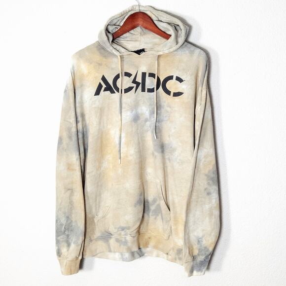 ACDC women's band hoodie in a sun-bleached taupe and gray tie-dye. Size large. Classic pullover fit with kangaroo pocket and drawstring hood. Features a bold black ACDC logo across the chest. The fabric is soft with a vintage-style fade, ideal for layering into a grunge, retro, or alt-style lineup.