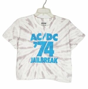 American Eagle AC/DC graphic band tee. Light gray and white tie dye. Cropped raw hem