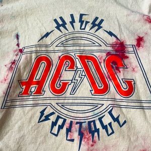 This top is from the ACDC rock band collection and has prints of pink tie dye splattered across the shirt.