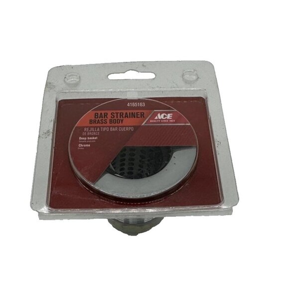 New in original factory package.ACE BAR STRAINER Brass Body 4165163 Chrome.The ACE Bar Strainer with a brass body and chrome finish is a stylish addition to any kitchen sink. This medium-sized sink strainer is designed to efficiently filter out water and prevent blockages in your sink. Constructed with stainless steel and brass materials, this durable strainer from Ace is perfect for keeping your kitchen running smoothly. The sleek silver color adds a touch of elegance to your kitchen decor.