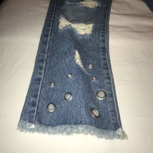 Cute, medium washed, ripped jeans. Bottoms are frayed with cute circular rings.