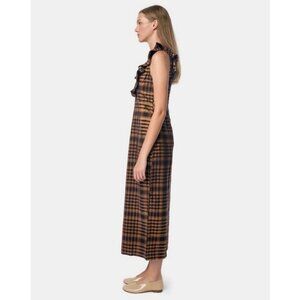 Magdalena Dress in St. Honore by Ace & Jig. Sleeveless maxi dress features an all-over rose gold plaid, empire waist, v neckline, shoulder ruffle details, and button placket that can be worn back to front.