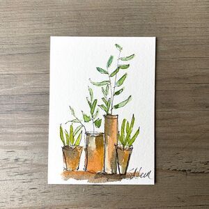 ACEO Painting Watercolor Ink Plants in Terracotta Pots Botanical Minimal Signed