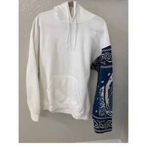 The hooded sweatshirt features a solid white and blue colorway with an embroidered design on the left sleeve.