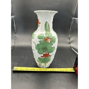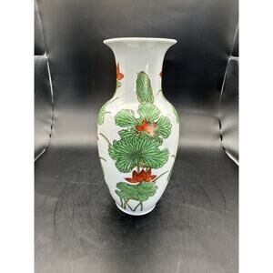 ACF Hong Kong Porcelain Vase 8.5” Floral Red Lotus Flowers with Green Leaves